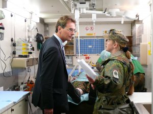 Mit einer Live-Vorführung stellte sich das Lazarett Regiment 11 aus Seeth dem CDU-Bundestagsabgeordneten Ingbert Liebing vor. Die Sanitätssoldaten zeigten, wie man einen Verletzten birgt und versorgt. Im anschließenden Gespräch mit dem Kommandeur Oberstleutnant Andreas Godau informierte sich Liebing zudem über das Kraftfahrausbildungszentrum in der Stapelholmer Kaserne.